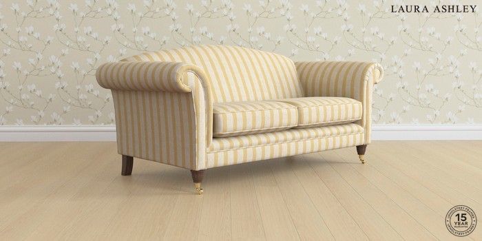 7.3.1 Buy Gloucester by Laura Ashley 3 Seater Small Sofa Kinsham Stripe Ochre Yellow Low Brass Castor - Chestnut from the Seasons online shop Click here to use our website with more accessibility support, for example screen readers