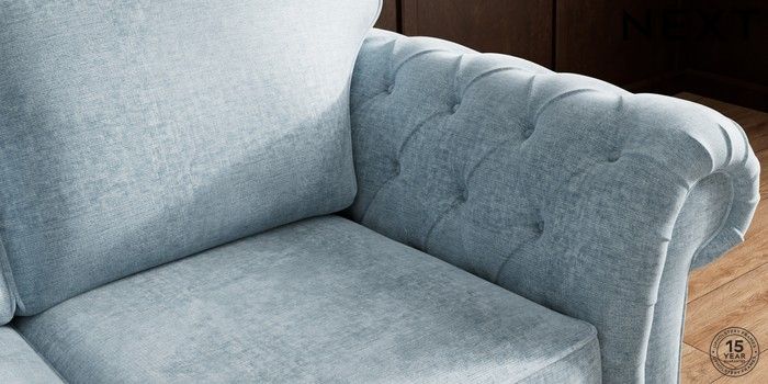 7.2.10 Buy Gosford Highback II Deep Sit 3 Seater Small Sofa Plush Chenille Light Blue Low Turned - Dark from the Seasons online shop Click here to use our website with more accessibility support, for example screen readers