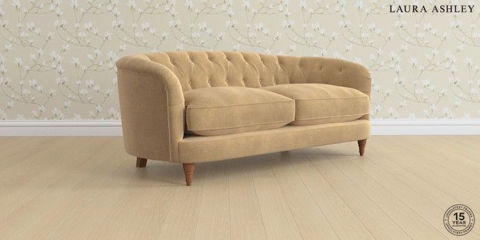 7.3.1 Buy Hathersage by Laura Ashley 3 Seater Small Sofa Lundar Chenille Caramel Natural Low Turned - Teak from the Seasons online shop Click here to use our website with more accessibility support, for example screen readers