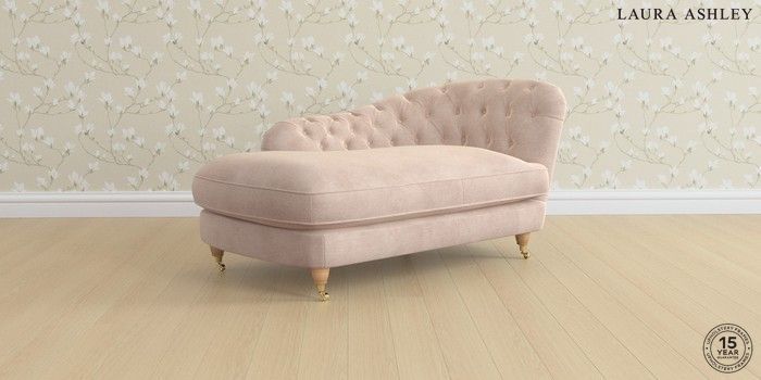 7.3.1 Buy Hathersage by Laura Ashley Chaise Longue Left Hand Orla Chalk Pink Low Brass Castor - Light Oak from the Seasons online shop Click here to use our website with more accessibility support, for example screen readers