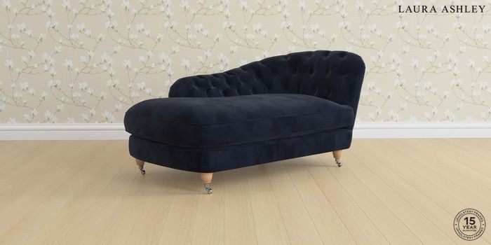 7.3.1 Buy Hathersage by Laura Ashley Chaise Longue Left Hand Orla Midnight Navy Low Chrome Castor - Light Oak from the Seasons online shop Click here to use our website with more accessibility support, for example screen readers