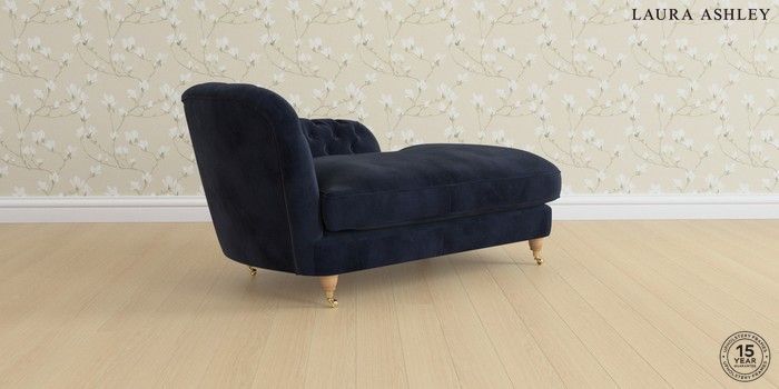 7.3.1 Buy Hathersage by Laura Ashley Chaise Longue Right Hand Orla Midnight Navy Low Brass Castor - Light Oak from the Seasons online shop Click here to use our website with more accessibility support, for example screen readers