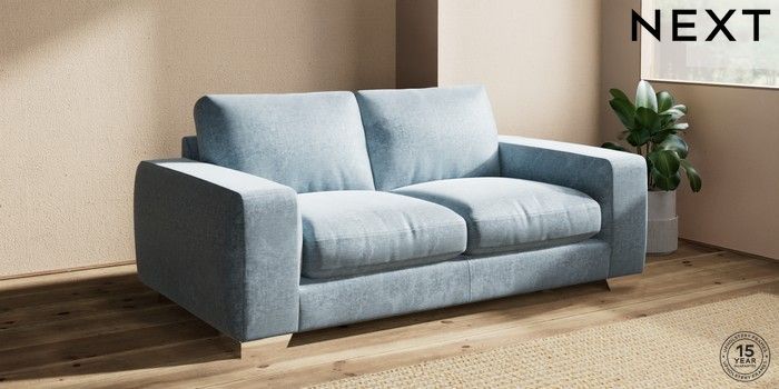 7.2.10 Buy Houghton Deep Relaxed Sit 3 Seater Small Sofa Plush Chenille Light Blue Large Square Angle - Chrome Metal from the Seasons online shop Click here to use our website with more accessibility support, for example screen readers