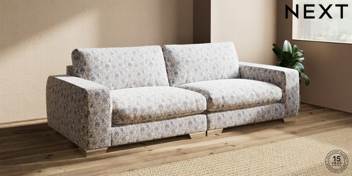 7.3.1 Buy Houghton Deep Relaxed Sit 4 Seater Sofa Relaxed Linen Look Print Woodblock Floral Blue Large Square Angle - Chrome Metal from the Seasons online shop