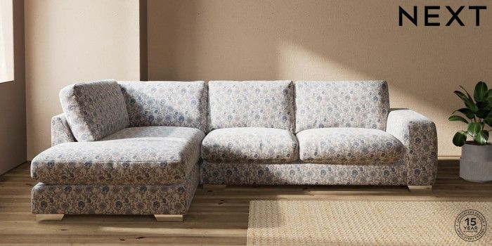 7.3.1 Buy Houghton Deep Relaxed Sit Large Corner Chaise - Left Hand Relaxed Linen Look Print Woodblock Floral Blue Large Square Angle - Chrome Metal from the Seasons online shop