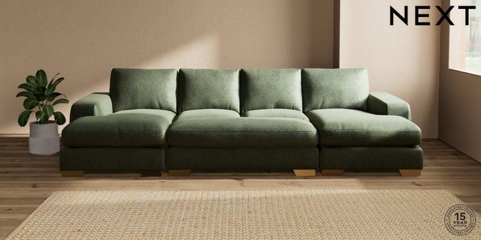 7.3.1 Buy Houghton Deep Relaxed Sit Large - U Shaped Double Chaise with Footstool Boucle Chenille Dark Moss Green Large Square Angle - Brushed Brass from the Seasons online shop Click here to use our website with more accessibility support, for example screen readers