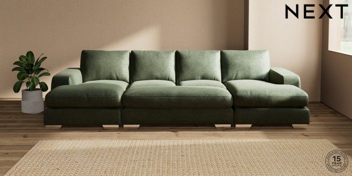 7.3.1 Buy Houghton Deep Relaxed Sit Large - U Shaped Double Chaise with Footstool Boucle Chenille Dark Moss Green Large Square Angle - Chrome Metal from the Seasons online shop Click here to use our website with more accessibility support, for example screen readers