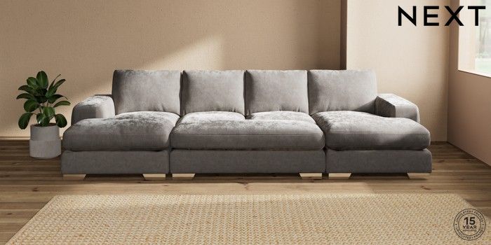 7.3.1 Buy Houghton Deep Relaxed Sit Large - U Shaped Double Chaise with Footstool Distressed Velour French Grey Large Square Angle - Chrome Metal from the Seasons online shop Click here to use our website with more accessibility support, for example screen readers