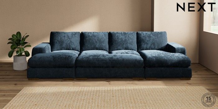 7.3.1 Buy Houghton Deep Relaxed Sit Large - U Shaped Double Chaise with Footstool Distressed Velour Midnight Blue Large Square Angle - Mid from the Seasons online shop Click here to use our website with more accessibility support, for example screen readers