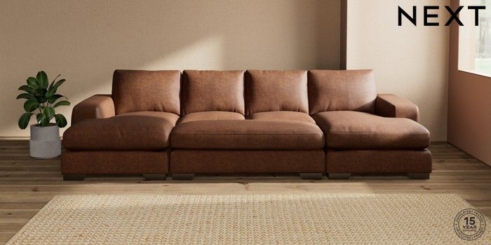 7.3.1 Buy Houghton Deep Relaxed Sit Large - U Shaped Double Chaise with Footstool Monza Faux Leather Easy Clean Chestnut Brown Large Square Angle - Gunmetal from the Seasons online shop