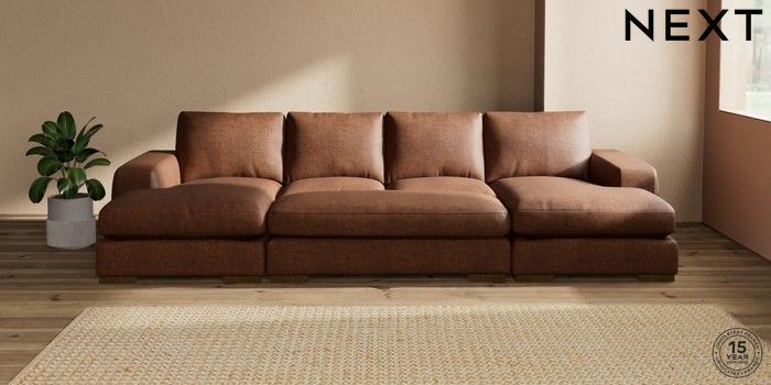 7.3.1 Buy Houghton Deep Relaxed Sit Large - U Shaped Double Chaise with Footstool Monza Faux Leather Easy Clean Chestnut Brown Large Square Angle - Mid from the Seasons online shop Click here to use our website with more accessibility support, for example screen readers