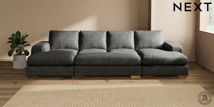 7.3.1 Buy Houghton Deep Relaxed Sit Large - U Shaped Double Chaise with Footstool Monza Faux Leather Easy Clean Dark Grey Large Square Angle - Brushed Brass from the Seasons online shop Click here to use our website with more accessibility support, for example screen readers