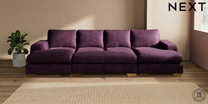 7.3.1 Buy Houghton Deep Relaxed Sit Large - U Shaped Double Chaise with Footstool Plush Chenille Dark Plum Purple Large Square Angle - Brushed Brass from the Seasons online shop Click here to use our website with more accessibility support, for example screen readers