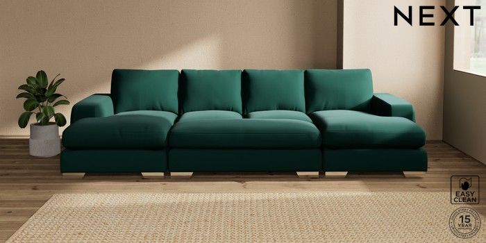 7.3.1 Buy Houghton Deep Relaxed Sit Large - U Shaped Double Chaise with Footstool Plush Velvet Easy Clean Bottle Green Large Square Angle - Chrome Metal from the Seasons online shop
