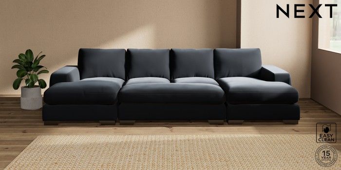 7.3.1 Buy Houghton Deep Relaxed Sit Large - U Shaped Double Chaise with Footstool Plush Velvet Easy Clean Charcoal Grey Large Square Angle - Gunmetal from the Seasons online shop