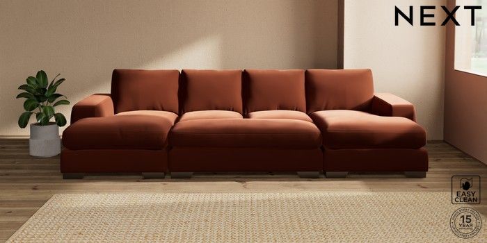 7.3.1 Buy Houghton Deep Relaxed Sit Large - U Shaped Double Chaise with Footstool Plush Velvet Easy Clean Ginger Orange Large Square Angle - Gunmetal from the Seasons online shop