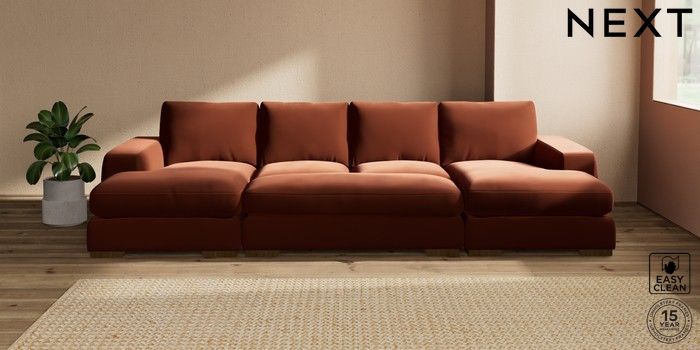 7.3.1 Buy Houghton Deep Relaxed Sit Large - U Shaped Double Chaise with Footstool Plush Velvet Easy Clean Ginger Orange Large Square Angle - Mid from the Seasons online shop Click here to use our website with more accessibility support, for example screen readers