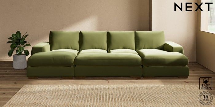 7.3.1 Buy Houghton Deep Relaxed Sit Large - U Shaped Double Chaise with Footstool Plush Velvet Easy Clean Mid Olive Green Large Square Angle - Mid from the Seasons online shop Click here to use our website with more accessibility support, for example screen readers