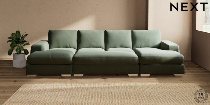 7.3.1 Buy Houghton Deep Relaxed Sit Large - U Shaped Double Chaise with Footstool Relaxed Linen Look Dark Green Large Square Angle - Chrome Metal from the Seasons online shop Click here to use our website with more accessibility support, for example screen readers