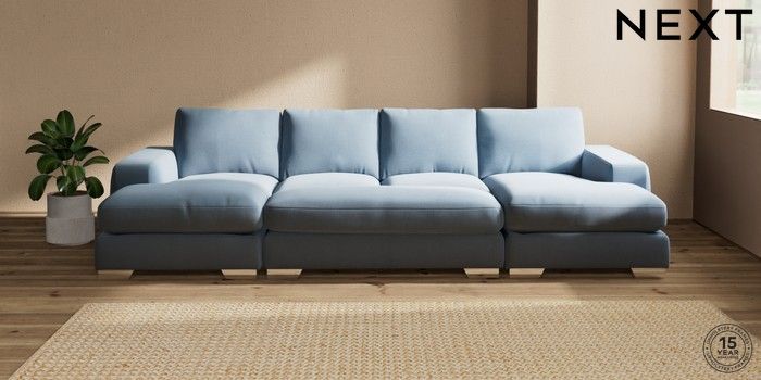 7.3.1 Buy Houghton Deep Relaxed Sit Large - U Shaped Double Chaise with Footstool Relaxed Linen Look Mid Blue Large Square Angle - Chrome Metal from the Seasons online shop Click here to use our website with more accessibility support, for example screen readers