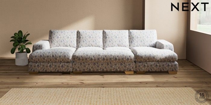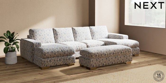 7.3.1 Buy Houghton Deep Relaxed Sit Large - U Shaped Double Chaise with Footstool Relaxed Linen Look Print Woodblock Floral Blue Large Square Angle - Brushed Brass from the Seasons online shop