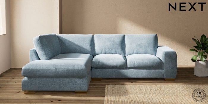 7.2.10 Buy Houghton Deep Relaxed Sit Medium Corner Chaise - Left Hand Plush Chenille Light Blue Large Square Angle - Brushed Brass from the Seasons online shop Click here to use our website with more accessibility support, for example screen readers
