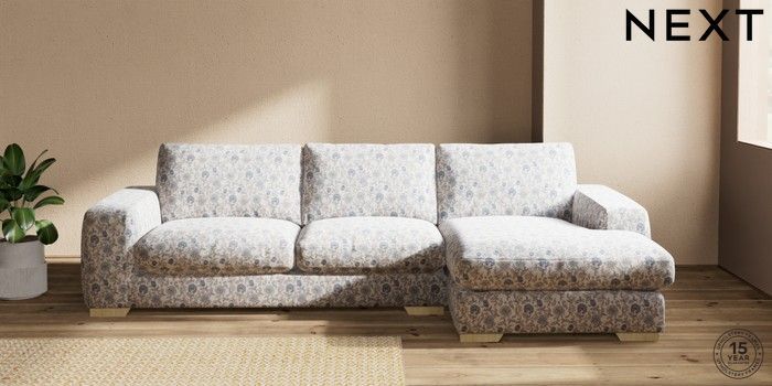 7.3.1 Buy Houghton Deep Relaxed Sit Sofa Chaise Bed - Right Hand Relaxed Linen Look Print Woodblock Floral Blue Large Square Angle - Light from the Seasons online shop Click here to use our website with more accessibility support, for example screen readers