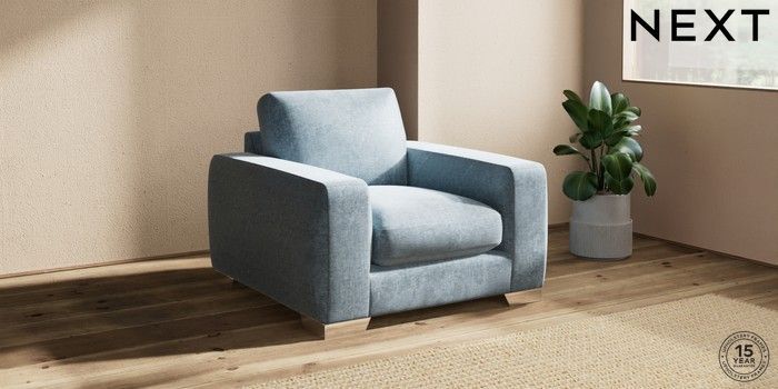 7.2.10 Buy Houghton Deep Sit Armchair Plush Chenille Light Blue Large Square Angle - Chrome Metal from the Seasons online shop Click here to use our website with more accessibility support, for example screen readers