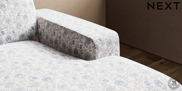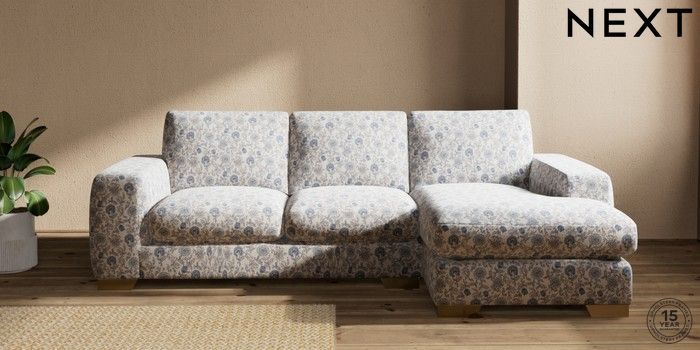 7.3.1 Buy Houghton Deep Sit Medium Sofa Chaise - Right Hand Relaxed Linen Look Print Woodblock Floral Blue Large Square Angle - Brushed Brass from the Seasons online shop Click here to use our website with more accessibility support, for example screen readers