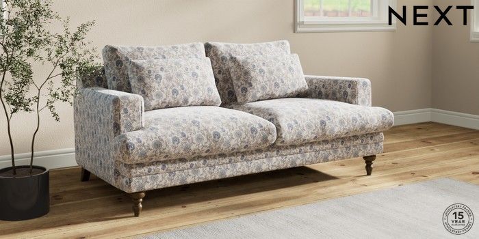 7.3.1 Buy Hutton Deep Relaxed Sit 3 Seater Small Sofa Relaxed Linen Look Print Woodblock Floral Blue Country Turned - Mid from the Seasons online shop