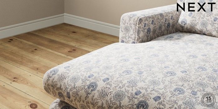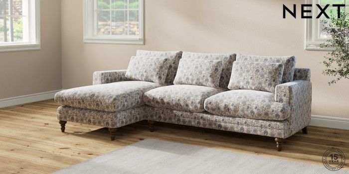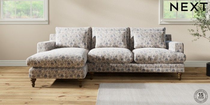 7.3.1 Buy Hutton Deep Relaxed Sit Medium Sofa Chaise - Left Hand Relaxed Linen Look Print Woodblock Floral Blue Country Turned - Mid from the Seasons online shop Click here to use our website with more accessibility support, for example screen readers