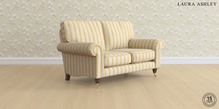 7.3.1 Buy Kingston by Laura Ashley 2 Seater Small Sofa Kinsham Stripe Ochre Yellow Low Brass Castor - Chestnut from the Seasons online shop Click here to use our website with more accessibility support, for example screen readers