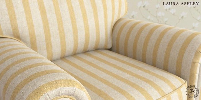 7.3.1 Buy Kingston by Laura Ashley Armchair Kinsham Stripe Ochre Yellow Low Brass Castor - Teak from the Seasons online shop