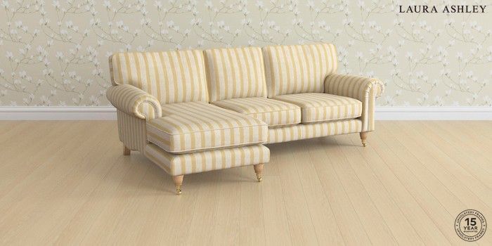 7.3.1 Buy Kingston by Laura Ashley Medium Sofa Chaise - Left Hand Kinsham Stripe Ochre Yellow Low Brass Castor - Light Oak from the Seasons online shop Click here to use our website with more accessibility support, for example screen readers