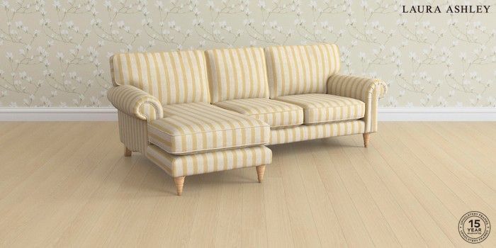 7.3.1 Buy Kingston by Laura Ashley Medium Sofa Chaise - Left Hand Kinsham Stripe Ochre Yellow Low Turned - Light Oak from the Seasons online shop Click here to use our website with more accessibility support, for example screen readers