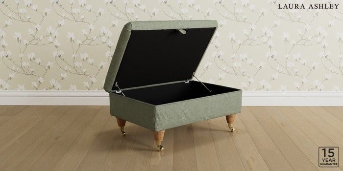 7.3.1 Buy Kingston by Laura Ashley Storage Footstool Anneliese Sage Green Low Brass Castor - Light Oak from the Seasons online shop Click here to use our website with more accessibility support, for example screen readers