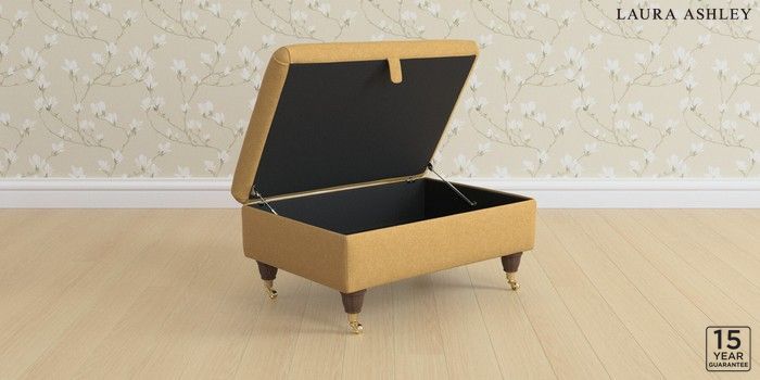 7.3.1 Buy Kingston by Laura Ashley Storage Footstool Peyton Ochre Yellow Low Brass Castor - Chestnut from the Seasons online shop Click here to use our website with more accessibility support, for example screen readers