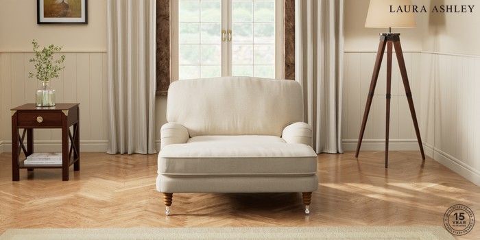 7.3.1 Buy Lynden by Laura Ashley Snuggle Chaise Anneliese Oyster Natural Ornate Chrome Castor - Teak from the Seasons online shop