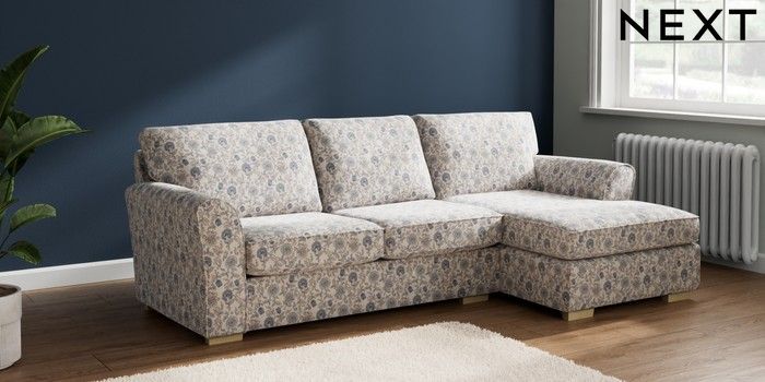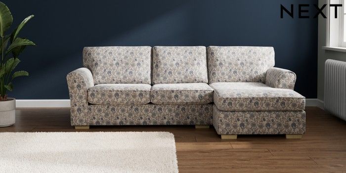 7.3.1 Buy Michigan II Medium Sofa Chaise - Right Hand Relaxed Linen Look Print Woodblock Floral Blue Slim Block - Light from the Seasons online shop