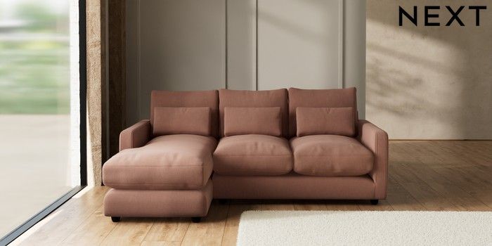 7.3.1 Buy N Premium Farndon Grand Relaxed Sit Medium Sofa Chaise - Left Hand Relaxed Linen Look Light Rust Brown Wooden Glide - Dark from the Seasons online shop Click here to use our website with more accessibility support, for example screen readers
