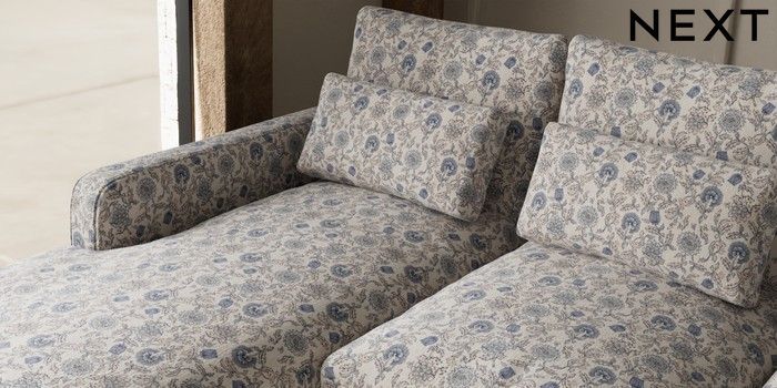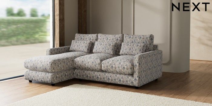 7.3.1 Buy N Premium Farndon Grand Relaxed Sit Medium Sofa Chaise - Left Hand Relaxed Linen Look Print Woodblock Floral Blue Wooden Glide - Dark from the Seasons online shop