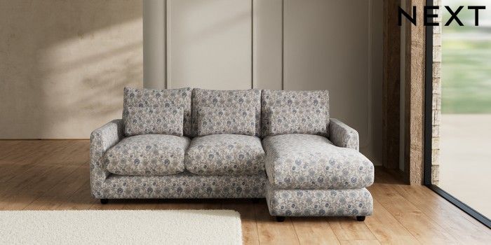 7.3.1 Buy N Premium Farndon Grand Relaxed Sit Medium Sofa Chaise - Right Hand Relaxed Linen Look Print Woodblock Floral Blue Wooden Glide - Dark from the Seasons online shop