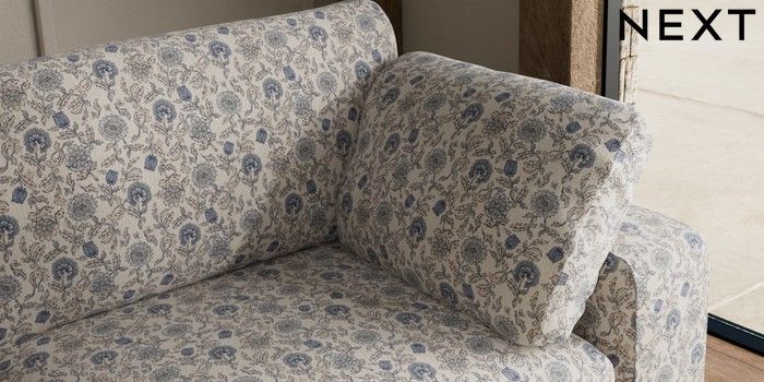 7.3.1 Buy N Premium The Snuggle Grand 4 Seater Large Sofa Relaxed Linen Look Print Woodblock Floral Blue Wooden Glide - Mid from the Seasons online shop