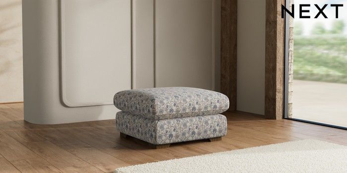 7.3.1 Buy N Premium The Snuggle Grand Footstool Relaxed Linen Look Print Woodblock Floral Blue Square Angle - Mid from the Seasons online shop