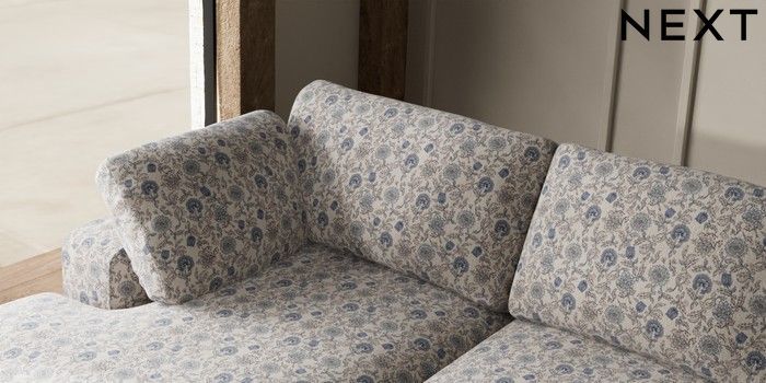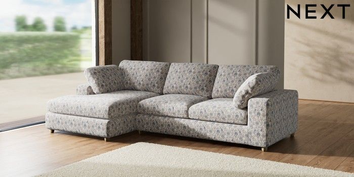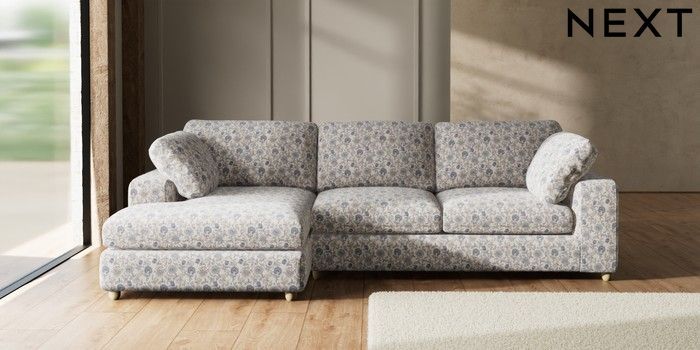 7.3.1 Buy N Premium The Snuggle Grand Large Sofa Chaise - Left Hand Relaxed Linen Look Print Woodblock Floral Blue Wooden Glide - Light from the Seasons online shop