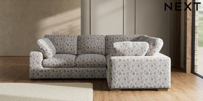 7.3.1 Buy N Premium The Snuggle Grand Medium Corner Sofa - Right Hand Relaxed Linen Look Print Woodblock Floral Blue Large Square Angle - Mid from the Seasons online shop