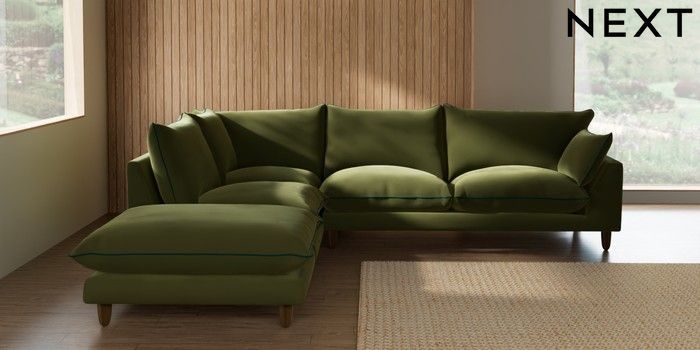 7.3.1 Buy Noa Deep Relaxed Sit Large Open End Corner Chaise - Left Hand Plush Velvet with Contrast Mid Olive Grn with Juniper Grn High Leg - Mid from the Seasons online shop Click here to use our website with more accessibility support, for example screen readers
