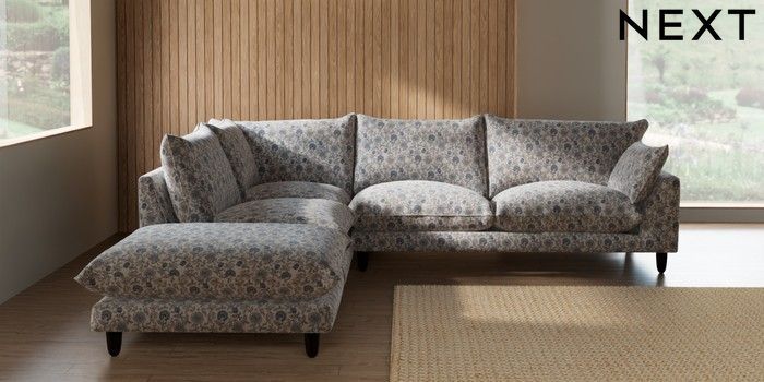 7.3.1 Buy Noa Deep Relaxed Sit Large Open End Corner Chaise - Left Hand Relaxed Linen Look Print Woodblock Floral Blue High Leg - Dark from the Seasons online shop
