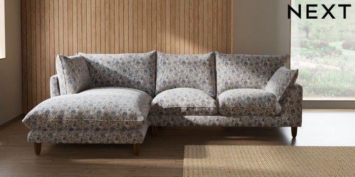 7.3.1 Buy Noa Deep Relaxed Sit Medium Corner Chaise - Left Hand Relaxed Linen Look Print Woodblock Floral Blue High Leg - Dark from the Seasons online shop Click here to use our website with more accessibility support, for example screen readers