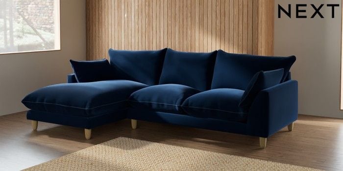 7.3.1 Buy Noa Deep Relaxed Sit Medium Sofa Chaise - Left Hand Plush Velvet with Contrast Navy Blue with Airforce Blue High Leg - Light from the Seasons online shop Click here to use our website with more accessibility support, for example screen readers
